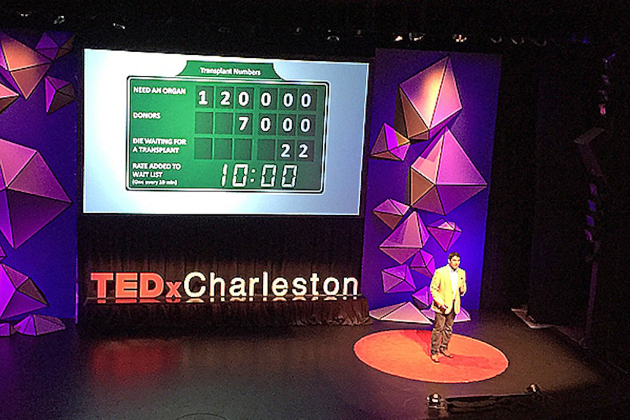 With that statement, Nadig flashed up a screen that showed a scoreboard of patients awaiting transplants. With over 120,000 people on the list and only about 7,000 donors, the odds aren’t good. Twenty-two people are dying each day waiting for a lifesaving organ. “In fact, in South Carolina, if you’re waiting for a kidney transplant, it’s an average of three to five years. And the clock is always ticking. Every 10 minutes another person is added to that list. By the time I finish this talk, another person will be put on the list. We are losing the game.”