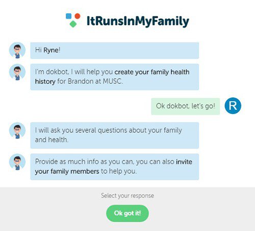 What sets ItRunsInMyFamily apart, besides its social features, is its user interface. Rather than filling out a form, patients have a conversation with “dokbot,” a sophisticated computer program that walks users through the family history collection process much like a real doctor or genetic counselor would.