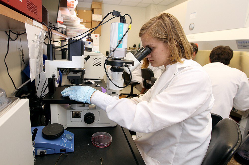 Intern Adriannah Drolapas, a Wofford College junior, plans to become a physician assistant or nurse. “We’ve been working with cancer drugs and I shadowed a doctor in the pediatric oncology wing. There was a child there with a brain tumor, and we’re using those brain tumor cells in the lab. It just made an impression on me. It was inspiring.”