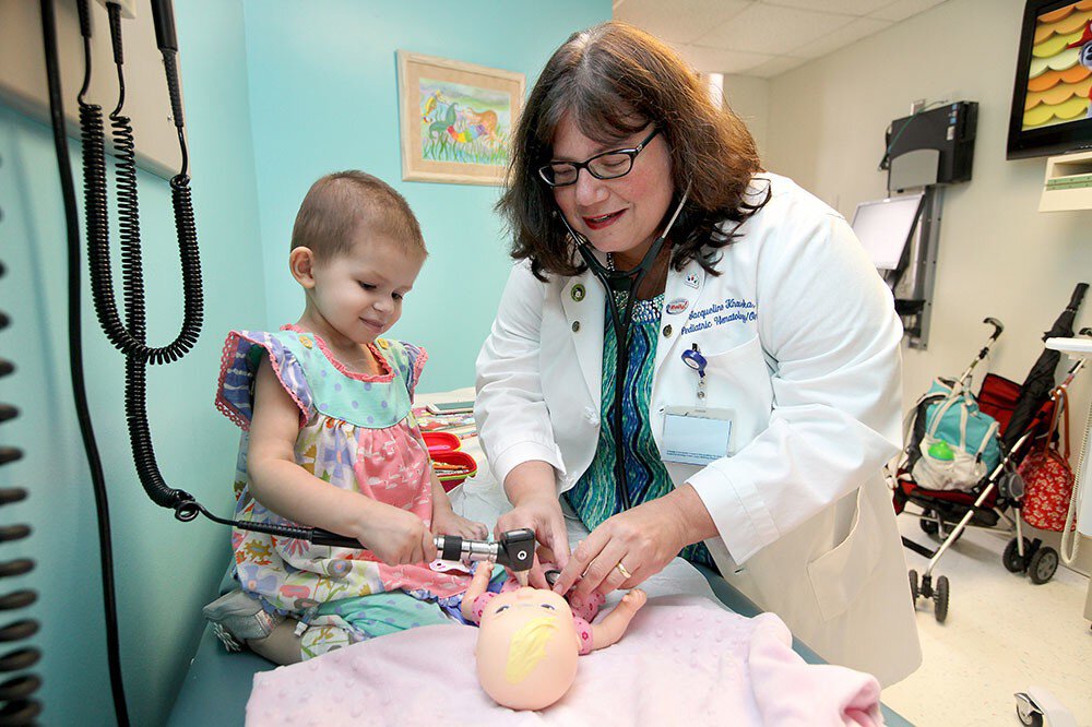 Victoria and Dr. Jacqueline Kraveka examine a doll during a checkup.