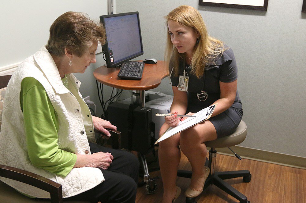 Dr. Tatsiana Beiko goes over test results with Helen Myers during a recent appointment in Mount Pleasant.