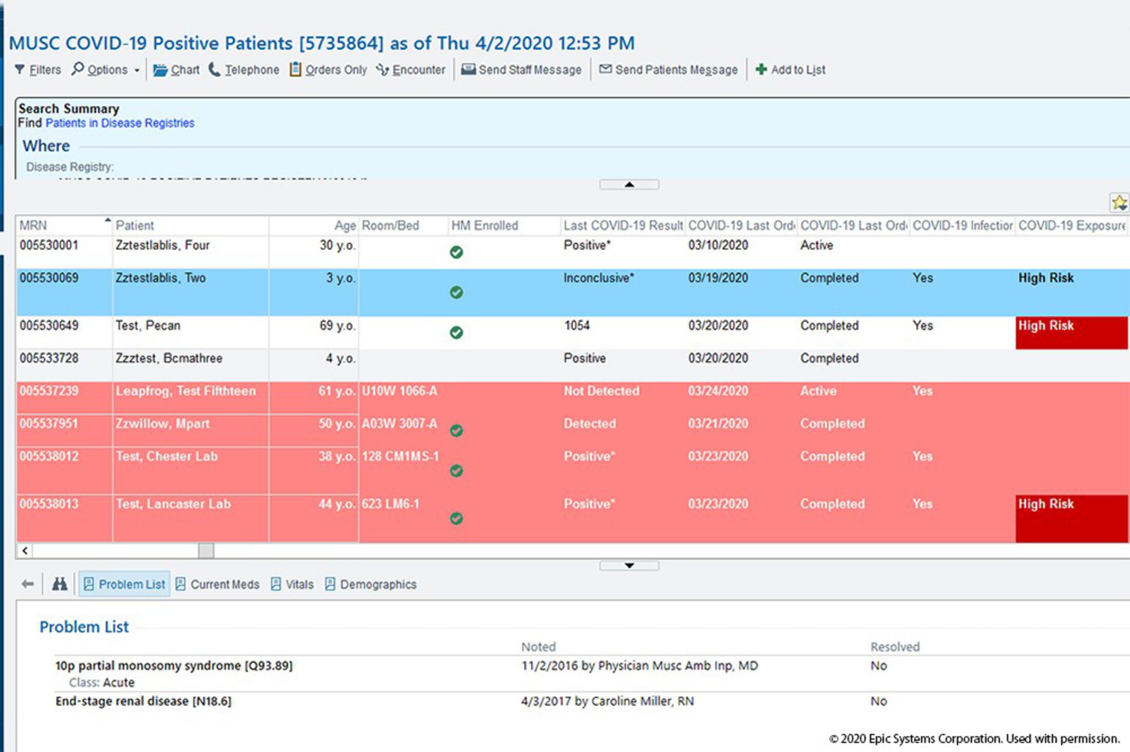 On the telehealth side of the screen, nurses can see a list of patients who’ve tested positive for COVID-19, including if they are considered high risk because of age or underlying health conditions.