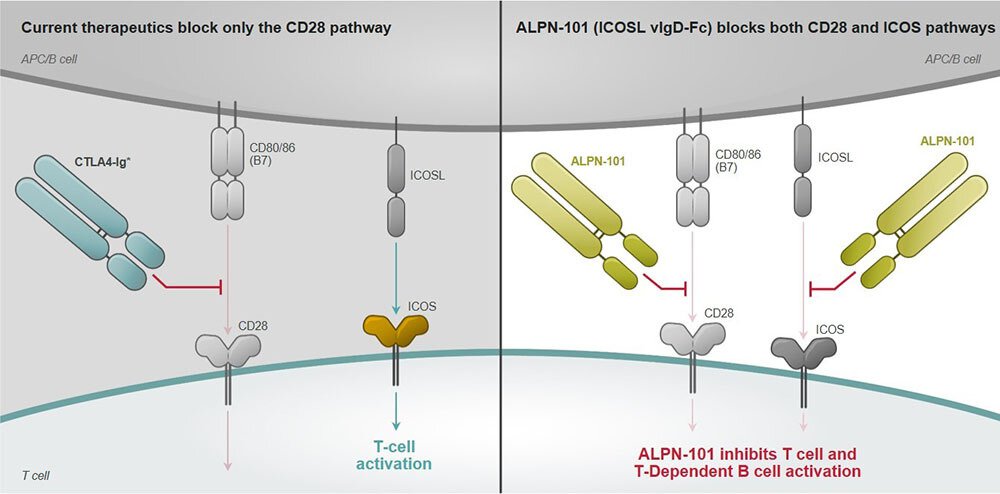 This figure depicts the two major T-cell co-stimulation pathways, ICOS and CD28, targeted by the new drug candidate ALPN-101, as compared to CTLA-4-Fc CD28/B7 pathway inhibitors (abatacept and belatacept) for the treatment of graft-versus-host disease.