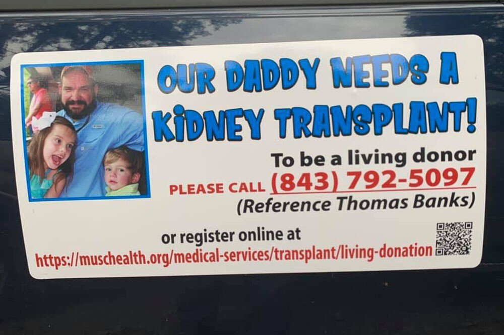 It showed two adorable children with their bearded, smiling father, Thomas Banks, and the words, “Our daddy needs a kidney transplant!” It included a phone number and web address.