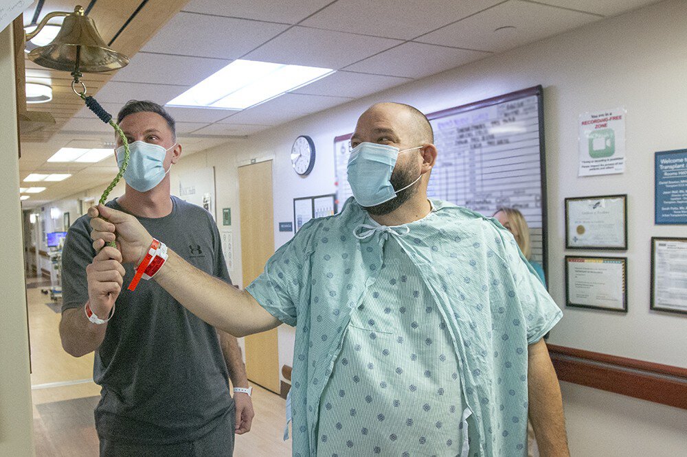 The next day, Yasin was the first to arrive in the hallway where he would finally meet Banks and they would ring a bell together to signal their successful transplant. He was smiling as he talked with his girlfriend and his mother. Then Banks came, dressed in a hospital gown and pulling an IV, with a smile on his face, too.