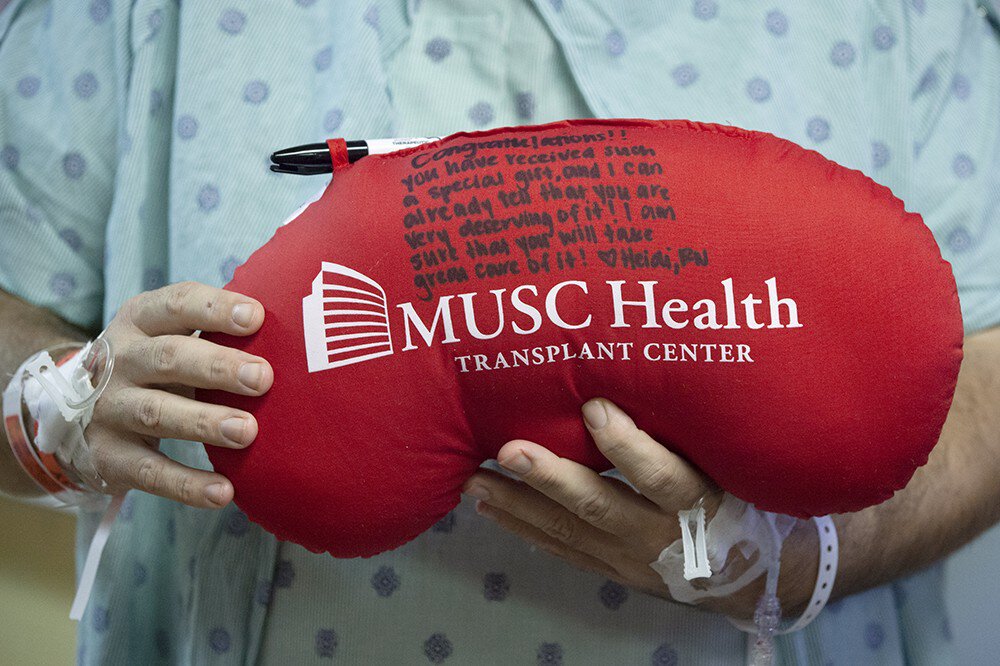 Banks holds a kidney-shaped pillow with a handwritten note from an MUSC Health nurse involved in his transplant.