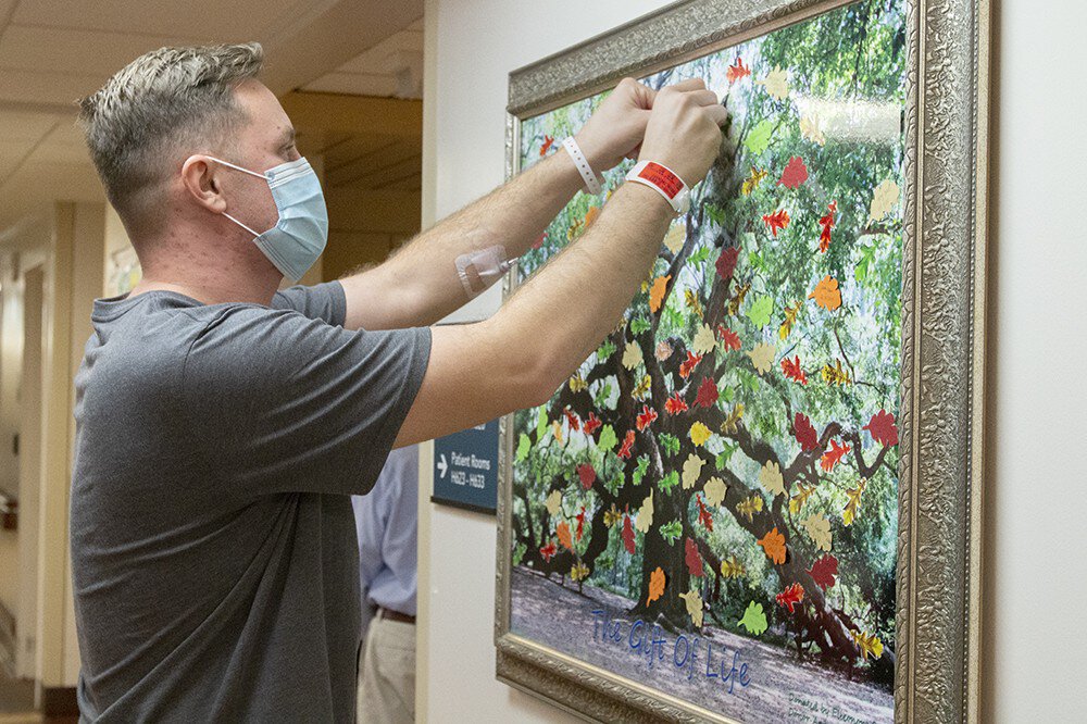 Yasin places a leaf on a painting called "The Gift of Life," something all kidney donors have the chance to do.