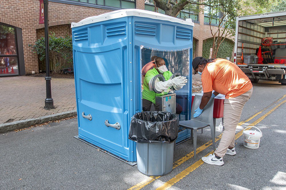 So Modrzynski and Pastre began experimenting with the plastic shells that usually house toilets. They sought to create a walk-up testing shelter that includes a barrier between the health care worker performing the test and the potentially infected people seeking tests.