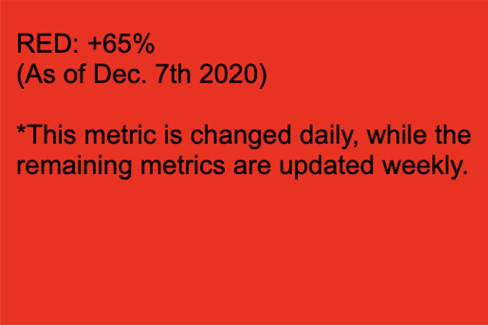 Another looks at whether there’s been a sustained reduction in new cases. It just went from yellow to red thanks to two weeks in a row of rising case numbers.