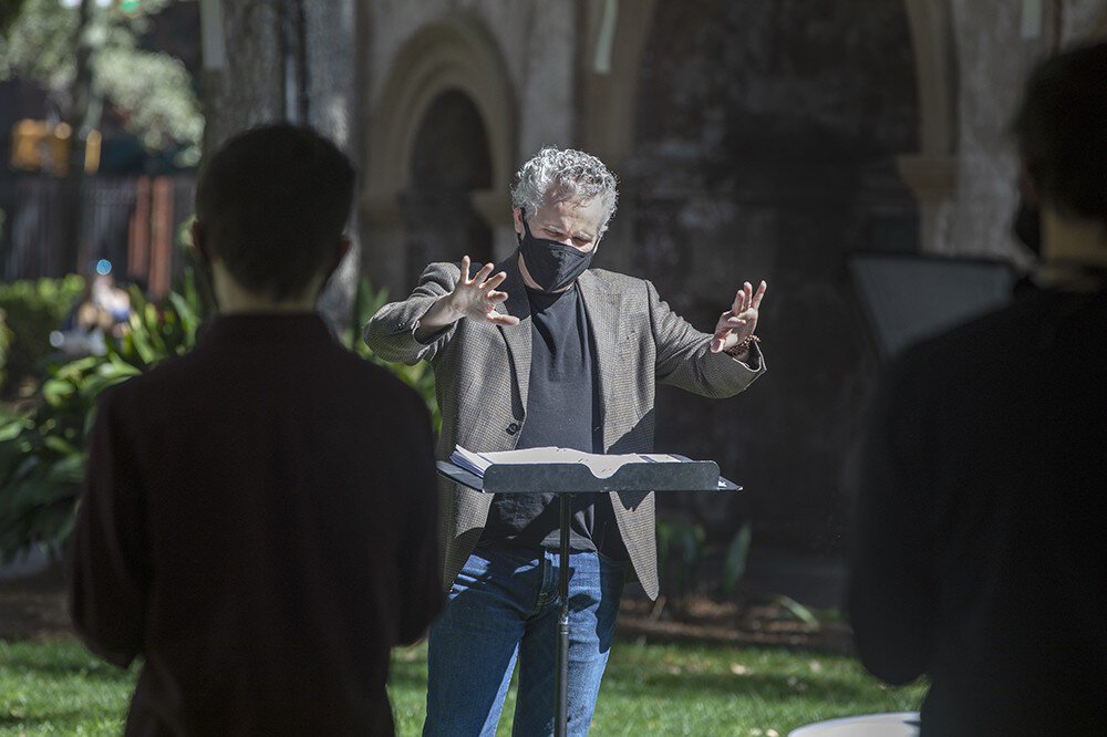Choral director Robert Taylor works outside with masked and socially distanced performers. Photo by Sarah Pack