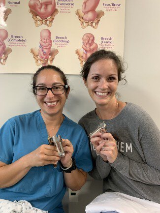 Dr. Megann Helton-Rieter and Dr. Lauren Brown with speculums