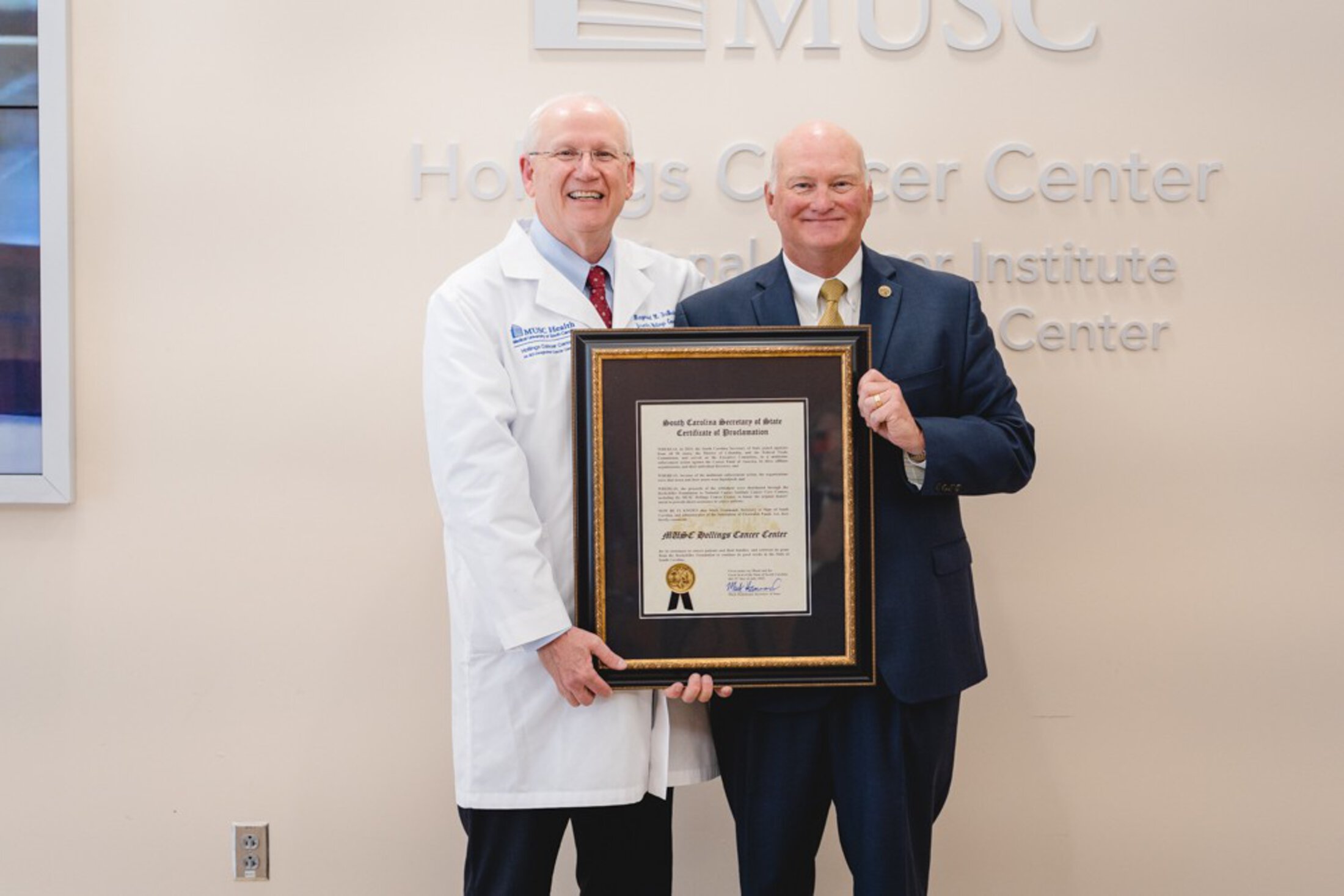On Wednesday, South Carolina Secretary of State Mark Hammond announced the allocation of a $39,024 disbursement to MUSC Hollings Cancer Center, following a landmark enforcement action against four sham charities and their directors.