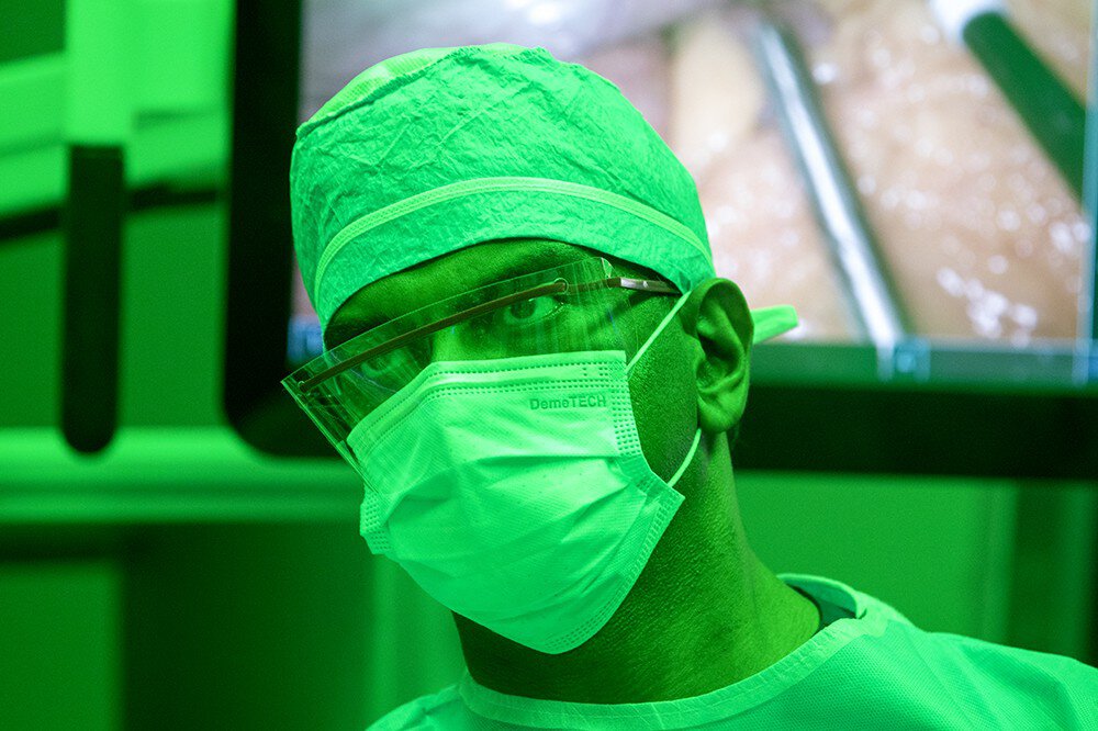 Dr. Rana Pullatt positions trocars in his patient before moving to the terminal to operate.