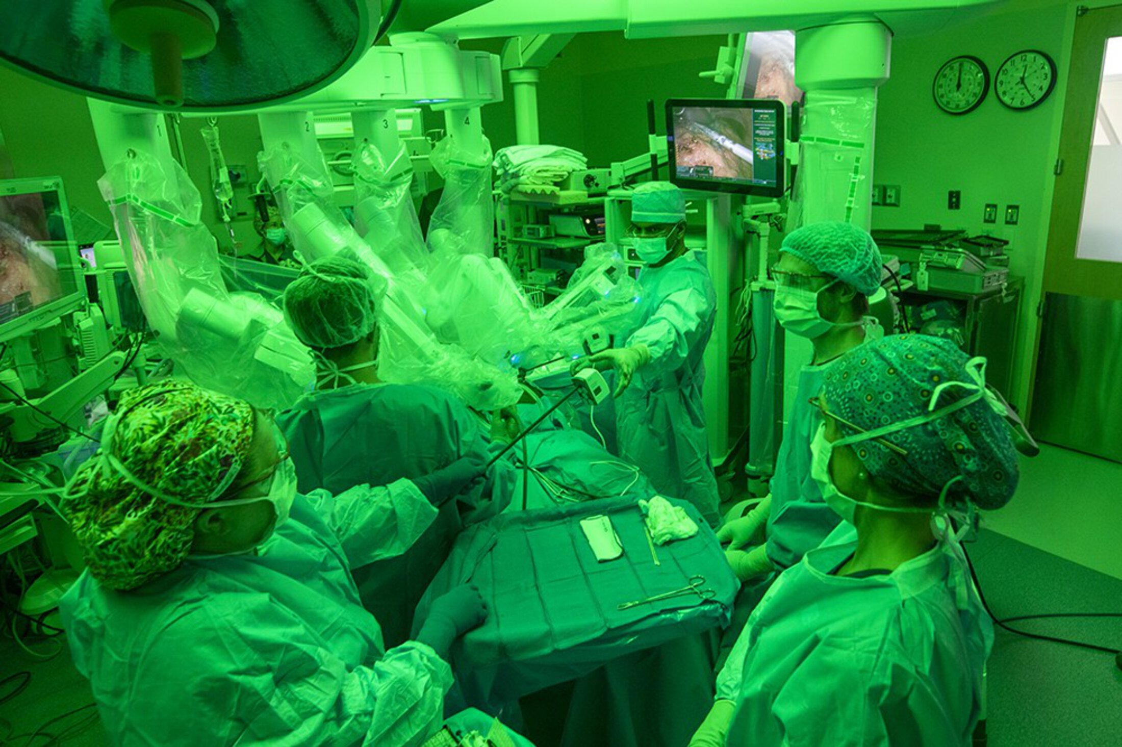 A team of eight doctors and nurses surround the patient, monitoring his well-being and making small adjustments to the robotic appendages whenever Pullatt requests. Occasionally, a tool will be swapped out, efficiently removed and slid back into place through one of the trocars – think of them as stainless-steel delivery tubes – connected to the robotic arms and running into the man’s abdomen.