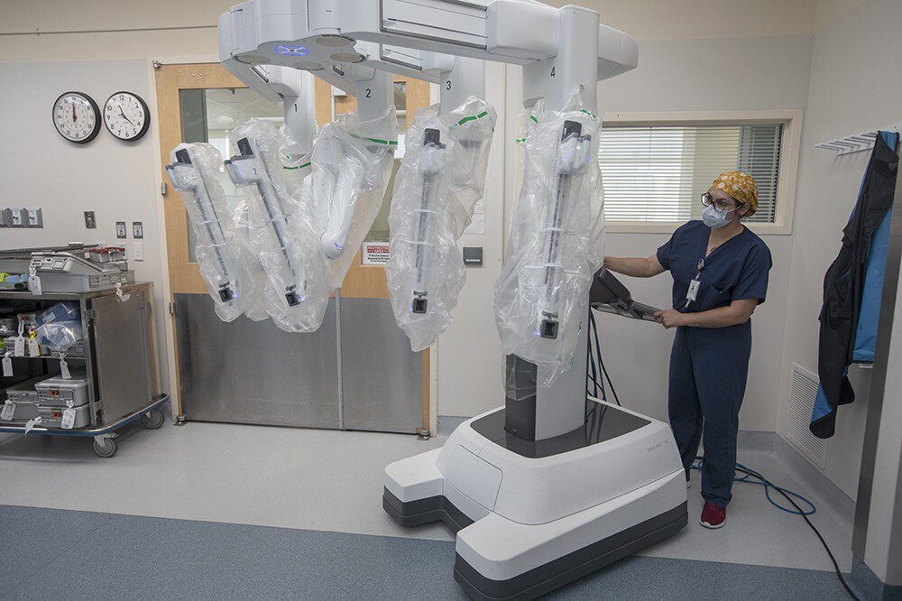 The DaVinci XI robot being moved into position.