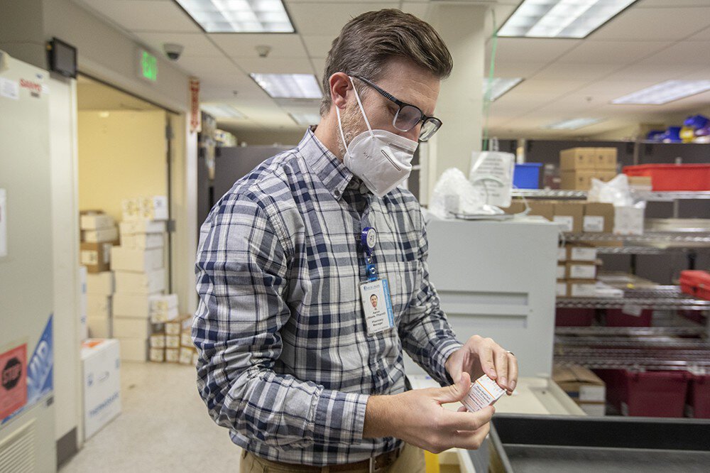 MUSC Pharmacy manager Aaron Steele, PharmD, holds the Pfizer pediatric COVID-19 vaccine vials.