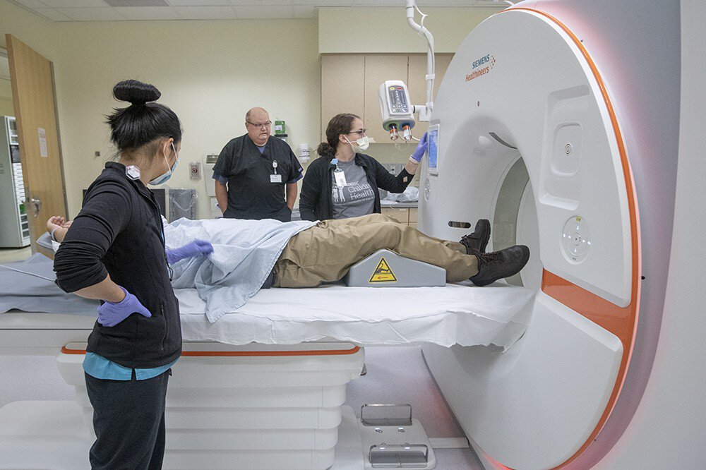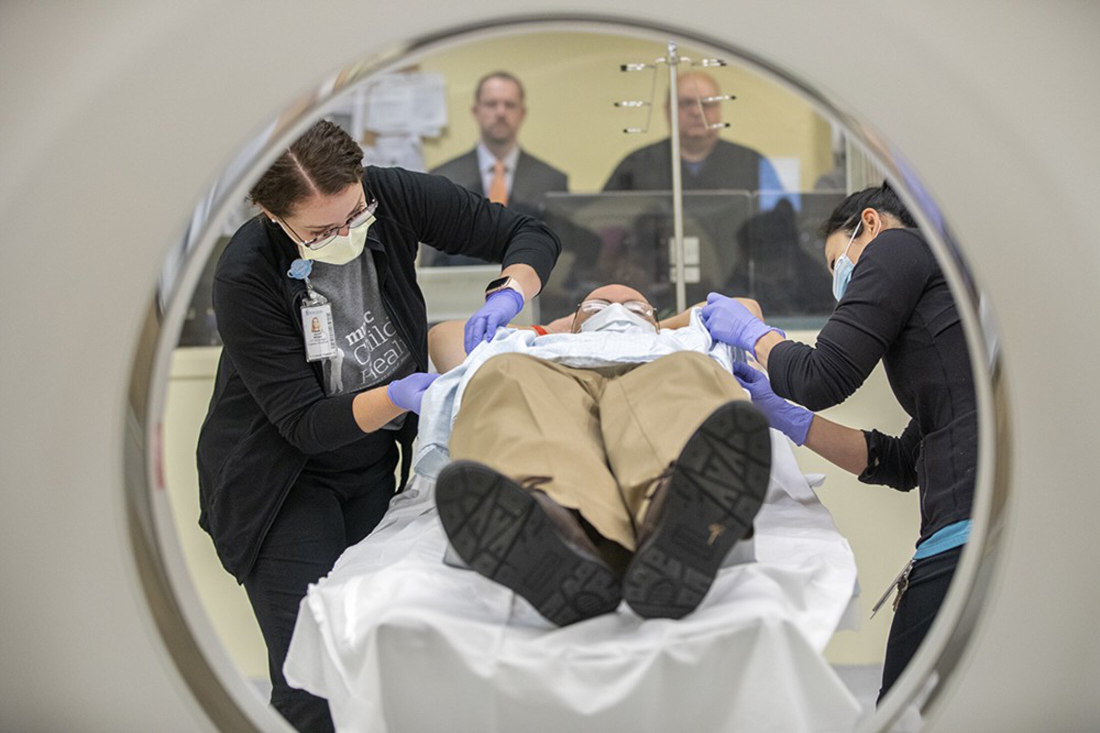 MUSC CT supervisor Elyse Wertis, left, talks with patient John Deasley as CT tech Jaclyn Wilson prepares the scanner.