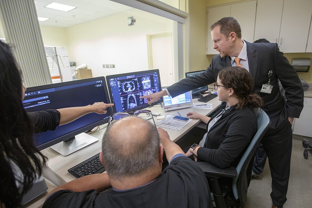 From left: MUSC CT supervisor Elyse Wertis, Siemens representative Pete Peoples, MUSC CT tech Jaclyn Wilson and Siemens product manager Matthew Fuld look at the details of the scan coming through on the new Siemens Healthineers photon-counting CT scanner at Ashley River Tower.