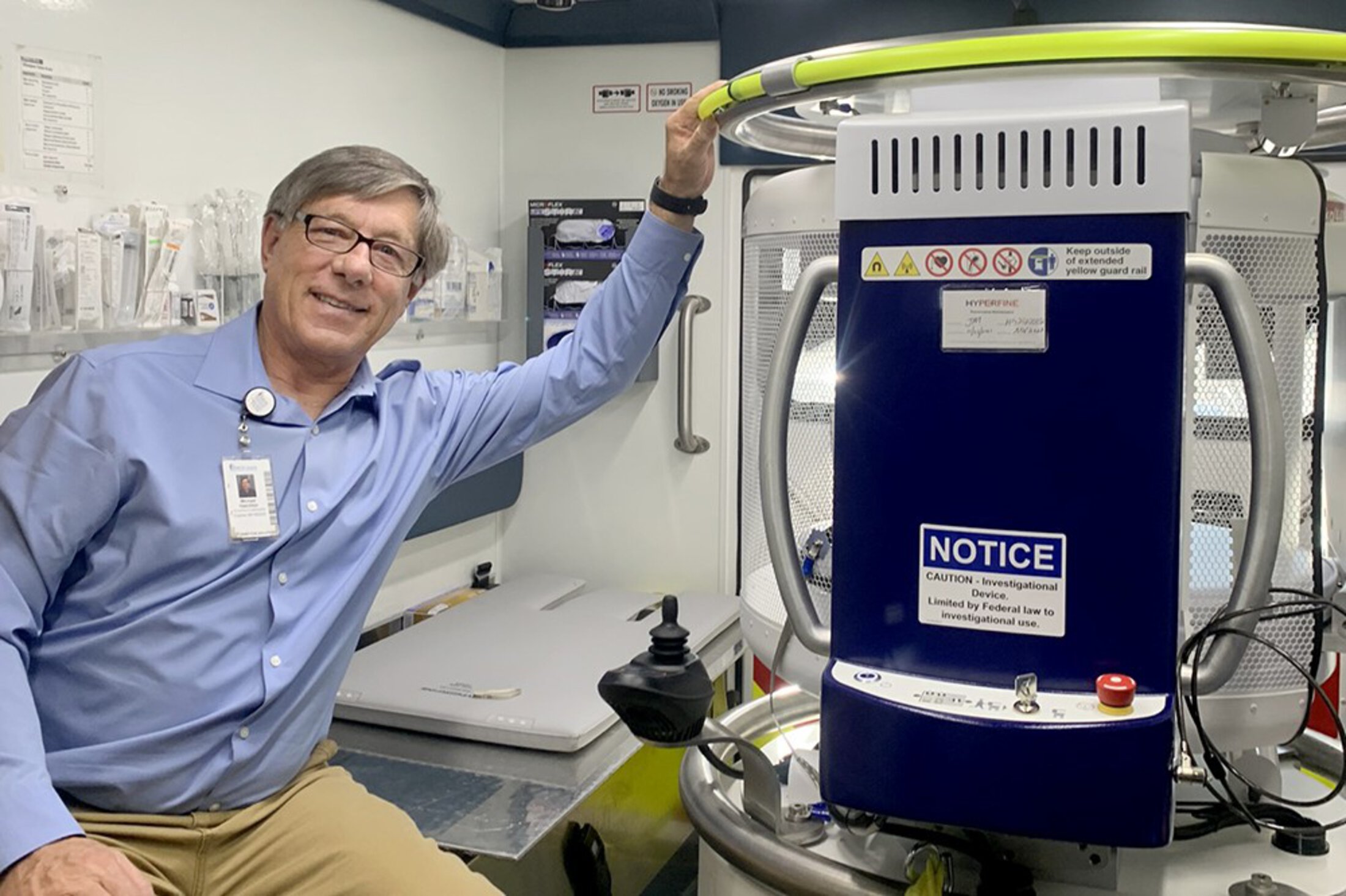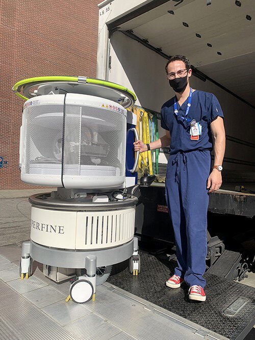 Neurology resident Mark Rosenberg, M.D., at the loading dock with the Hyperfine MRI.