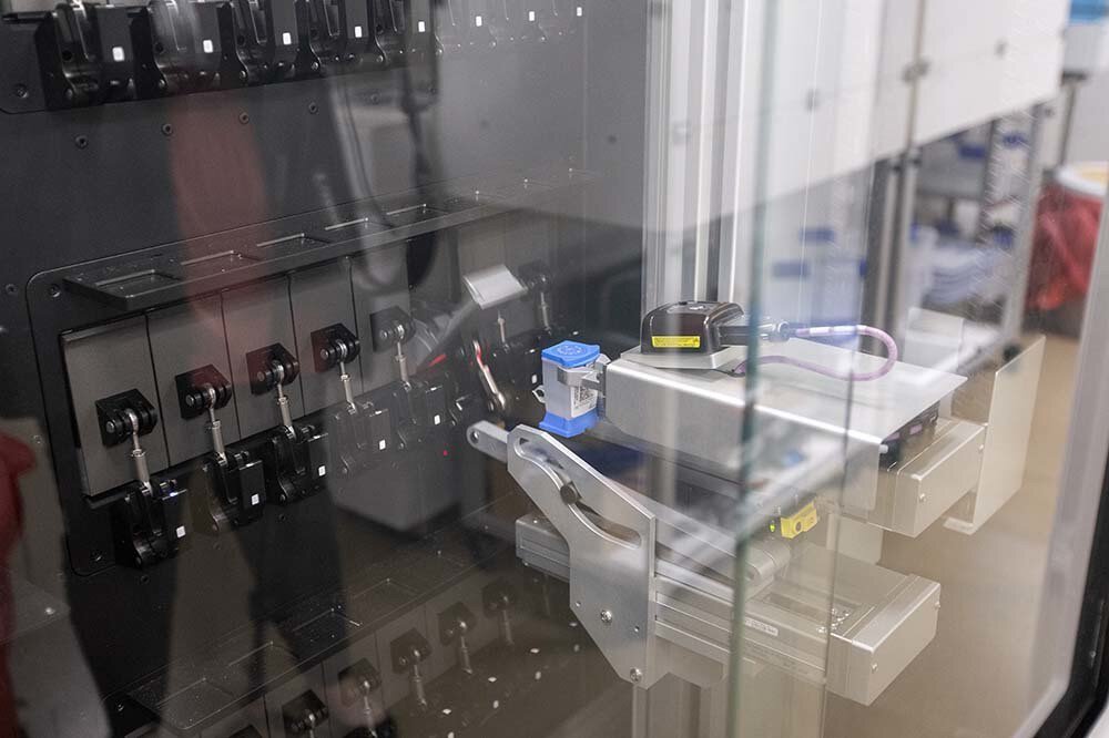 Once Hill or a colleague finishes checking in samples, they’re carefully transferred to tubes and prepared for the next steps. Then, the laboratory has multiple machines at its disposal for testing, including the Panther System, the Abbott m2000 and the Abbott Alinity.