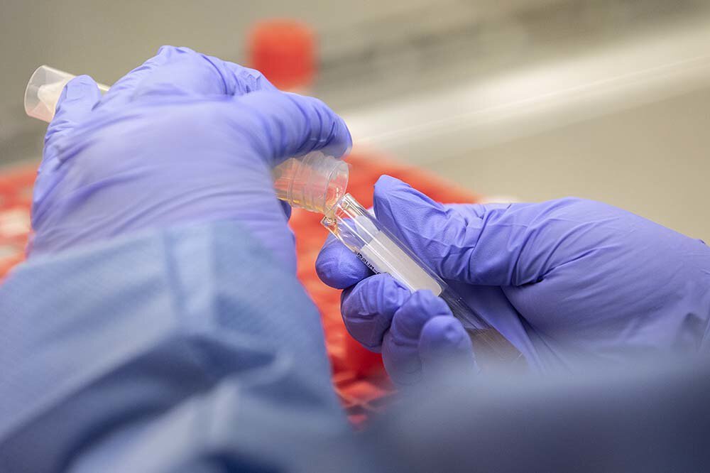 Liquid from a nasal swab is poured into a tube for testing.