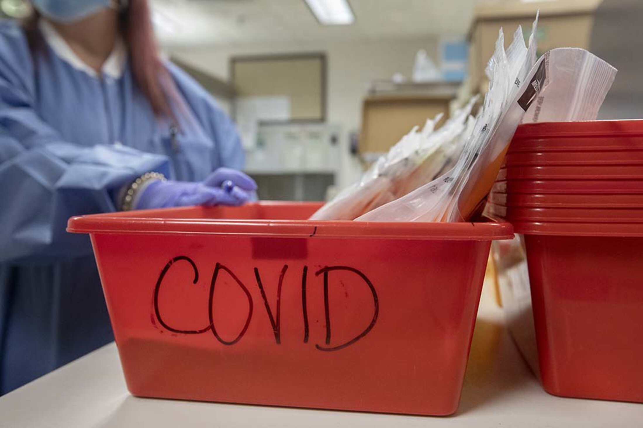 “What we’re doing here is called manifesting,” she said, as she checked labels on bags containing nasopharyngeal or mid-turbinate swabs. “We’re bringing in the samples. All the samples that come in from other locations, they put information on the manifest list that we then check to make sure that what comes in is actually what’s in the bag.”