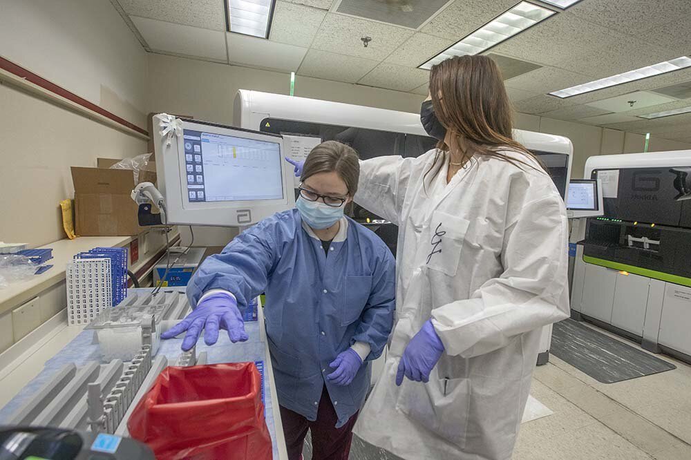 Lab associate Katlin Thompson, left, and technician Glenda Rebl prepare samples for testing in the Abbott Alinity machine, one of several options at MUSC that can handle COVID tests.