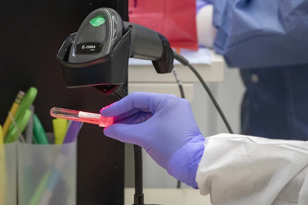 A label on a test sample is scanned to get the patient’s name and information into the system before testing.