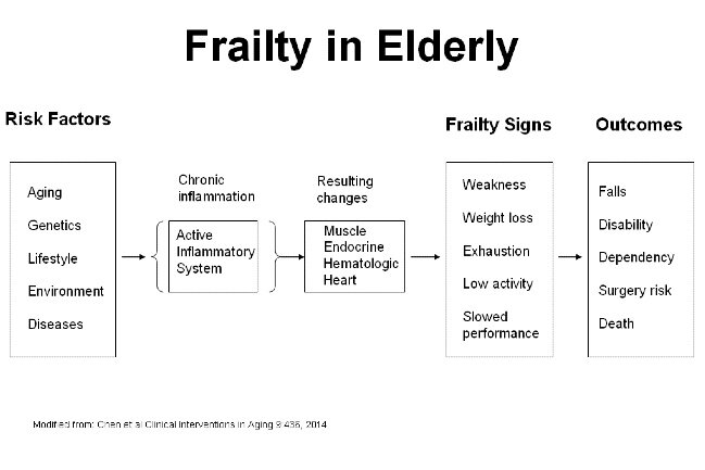 Figure 1.Risk factors, causes, signs, organs/systems affected, and outcome of frailty in the elderly.
