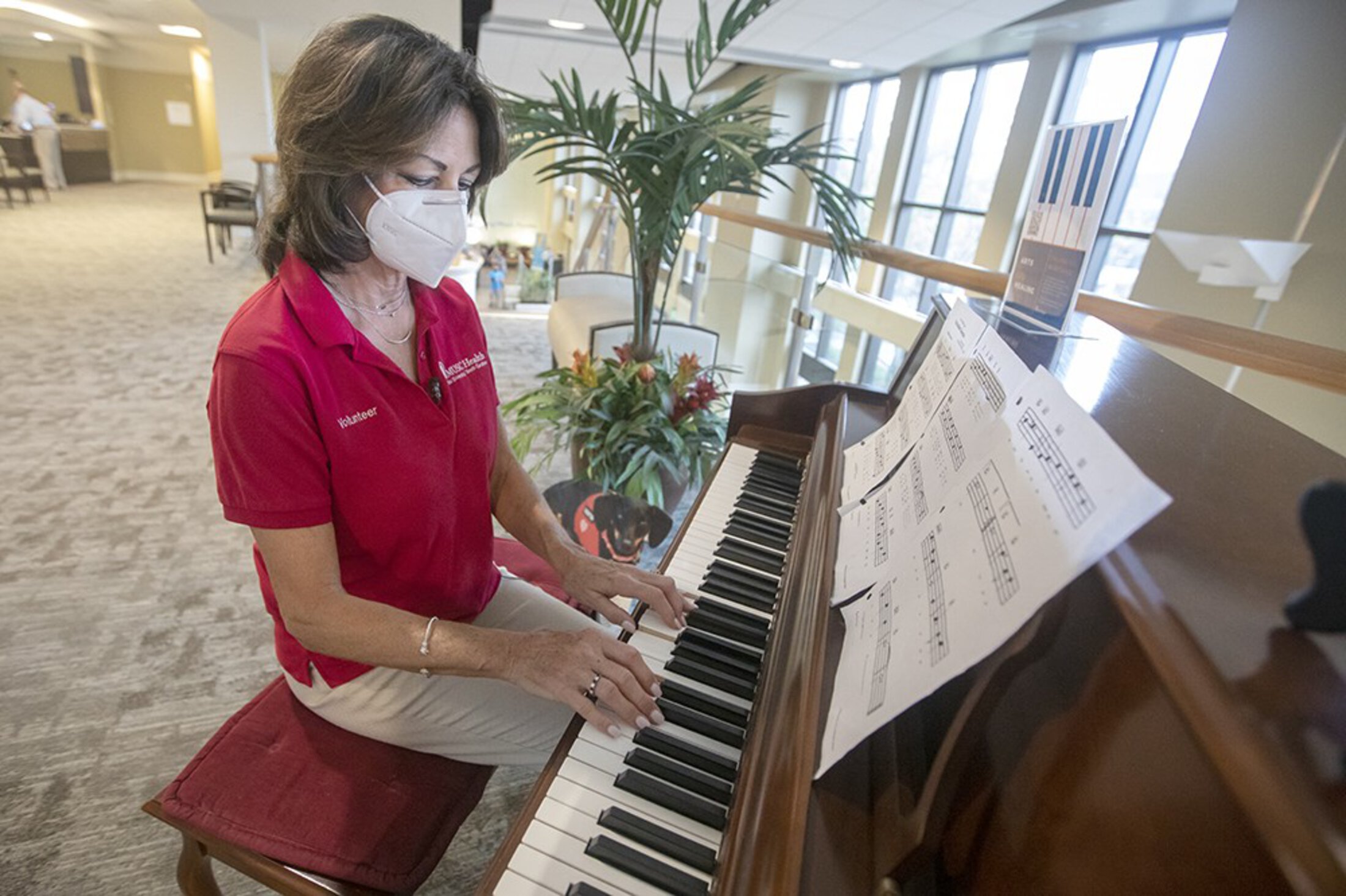 Her fingers move lightly up and down the piano keyboard, the gentle sound wafting down from the open second floor to reach patients and employees in waiting areas on the first and second levels of the MUSC Health East Cooper Medical Pavilion in Mount Pleasant. She hopes the music can soothe stressed or worried patients.