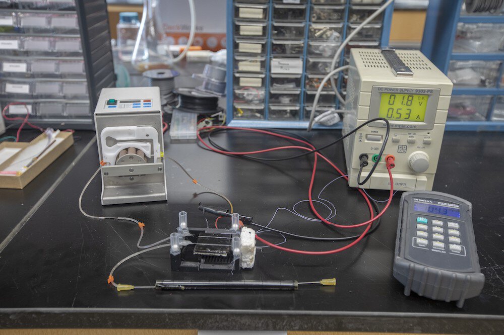The novel device includes a heating element to get the nanoparticles to release the chemotherapy drug and an activated carbon filter to remove the drug. Photograph by Sarah Pack.