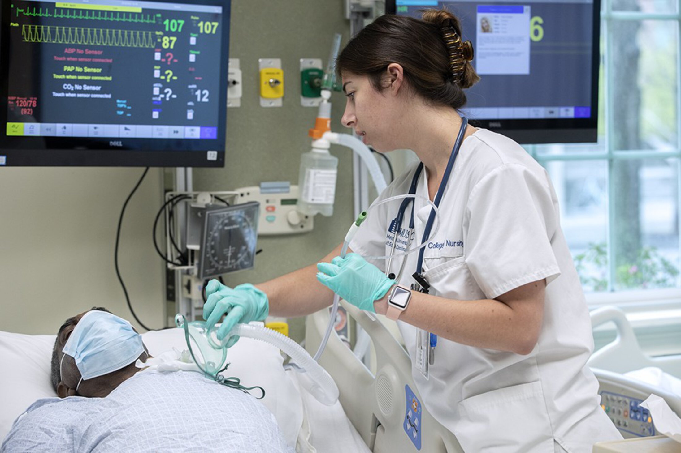The Sim Lab can be set up to run a variety of scenarios, depending on the course. The manikins express complaints and doctors provide orders in prerecorded snippets of conversation. The monitors at the bedsides provide the student nurses with information about the patients’ vital signs. Terzulli and Neeley, sitting behind one-way glass, can observe and hear everything.
