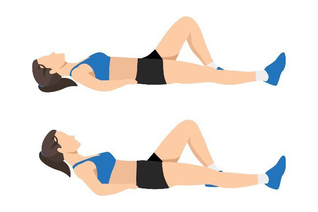 - Point your toes on your right leg up so you’re contracting your quad muscles and pressing into the floor. Bring your chin to your chest, raising your shoulders slightly off the floor. Hold for eight to ten seconds and relax. That is one rep. Do a total of six reps, then four reps, and end with two reps for a total of three sets. Pause for three to five seconds between each rep.