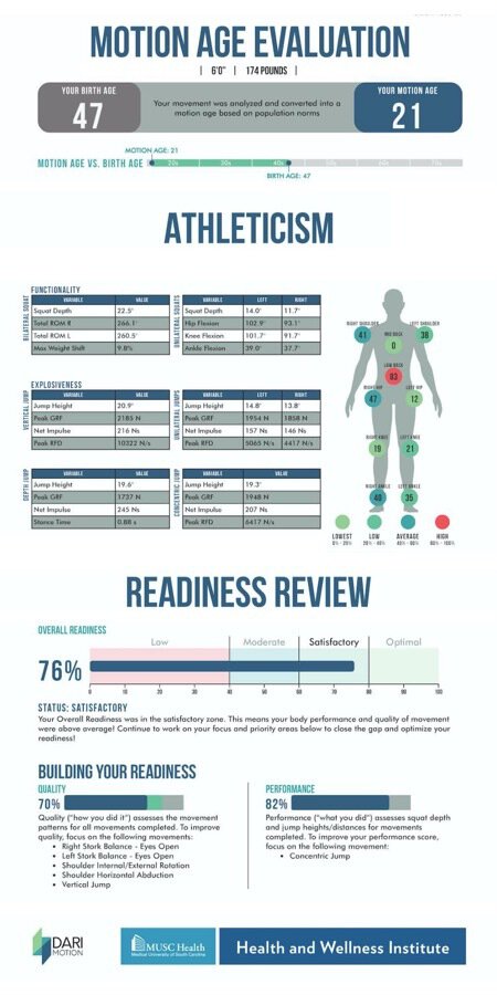 “But don’t just take my word for it,” he said. Instead, he invited me to MUSC Health’s Health and Wellness Institute in Mount Pleasant to try out a new FDA-approved technology called DARI Motion. Though still relatively new, it’s already being utilized by Olympic athletes, NFL players and college athletic programs across the nation. It operates by using eight high-speed cameras, proprietary motion-capture software, cloud processing analytics and lots of other really cool terms I copied from their website.