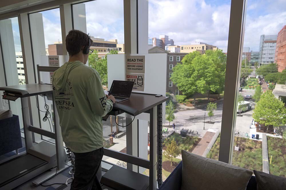 The library and education center also has a coffee shop, the Innovation Station tech store, University archives, fully equipped patient rooms for students to get firsthand experience, a simulation center, treadmill workstations and more.
