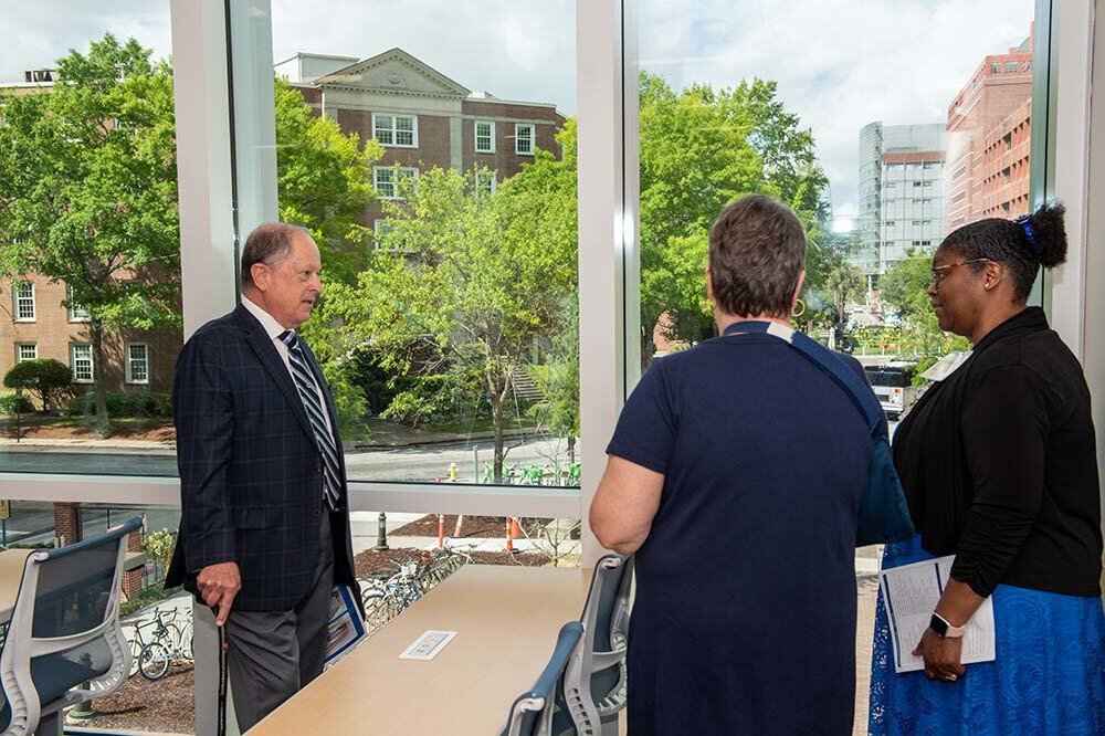 The library and education center that bear his name are popular sites. The pharmacy students who were in the sunny nook during the grand opening ceremony were especially pleased to see the library reopen. Price said that in the old pharmacy building, there weren’t really any study rooms.