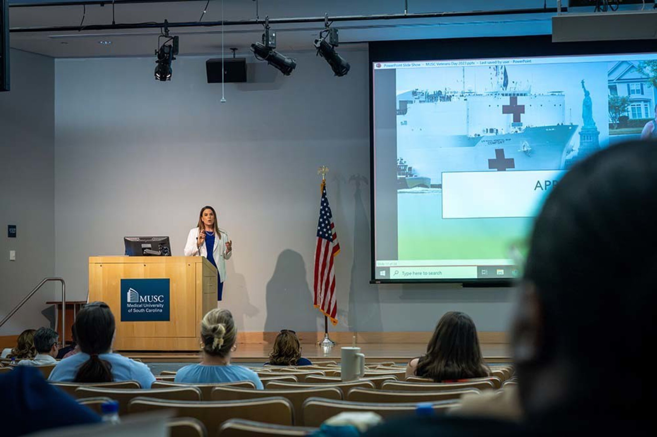 Durham was the keynote speaker for the event. She shared with the audience about her time working on the front lines of the COVID-19 pandemic in New York City, the epicenter of the virus in those early days. Durham, the newly appointed dean of MUSC’s College of Nursing, is a proud veteran, having joined the United States Navy in 1995. Since 2007, she has served in the Navy Reserve, where she holds the rank of captain. Her service in the Navy Nurse Corps led her to New York City to help during a very demanding time.