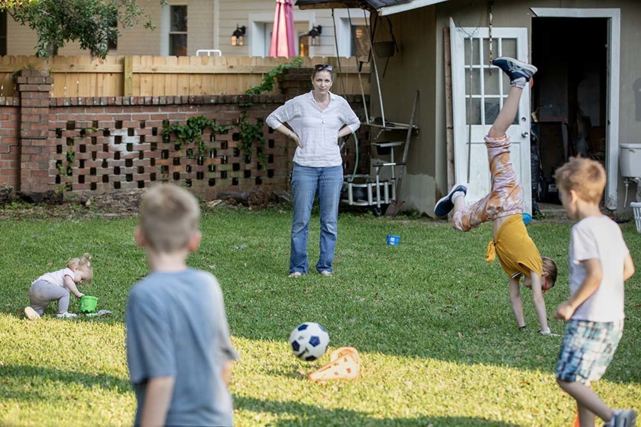 Krystal Nolan holds her daughter Evelyn, while her husband Jim holds Conor. Amelia and Patrick are on the grass and Jimmy is standing next to his mother.