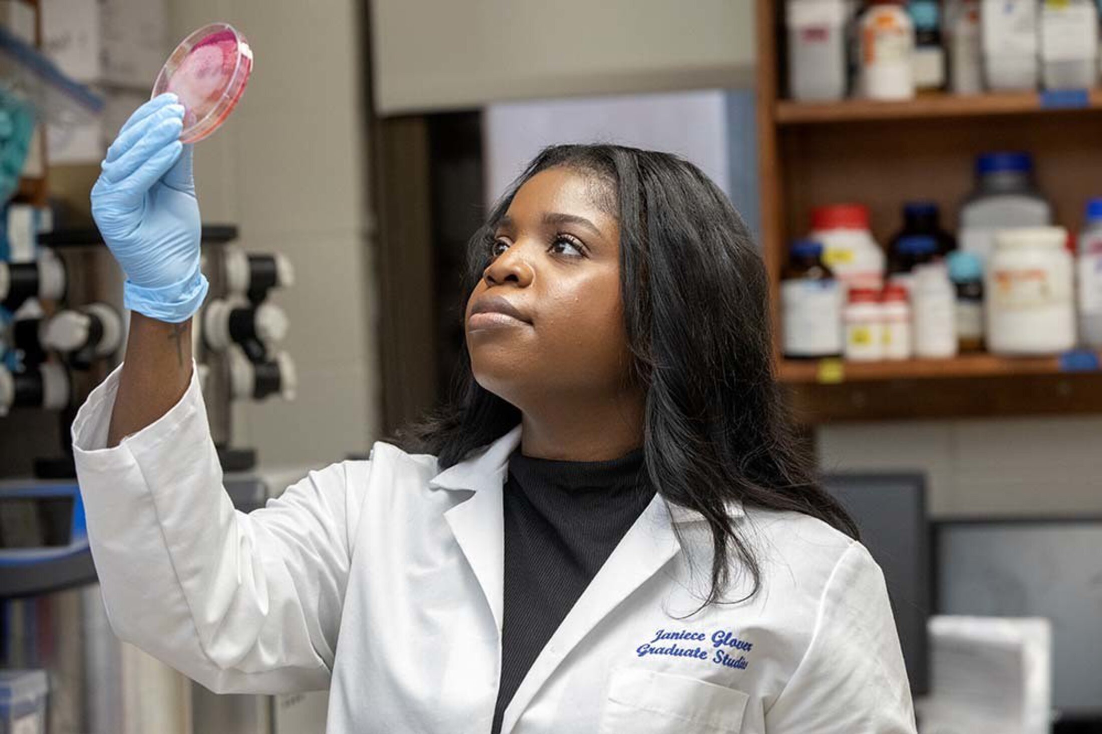 For Glover, research has always been deeply personal. During her master’s work, she studied cardiology issues, something her father’s side of the family is prone to. While working toward her doctorate, she focused on advancing understanding of the microbiome, a key component of gut health, an area of the body that her mother’s side is prone to having problems with. Glover’s research on the microbiome, in particular her work in the pathogenic bacteria Acinetobacter, has been featured in several high-impact publications.