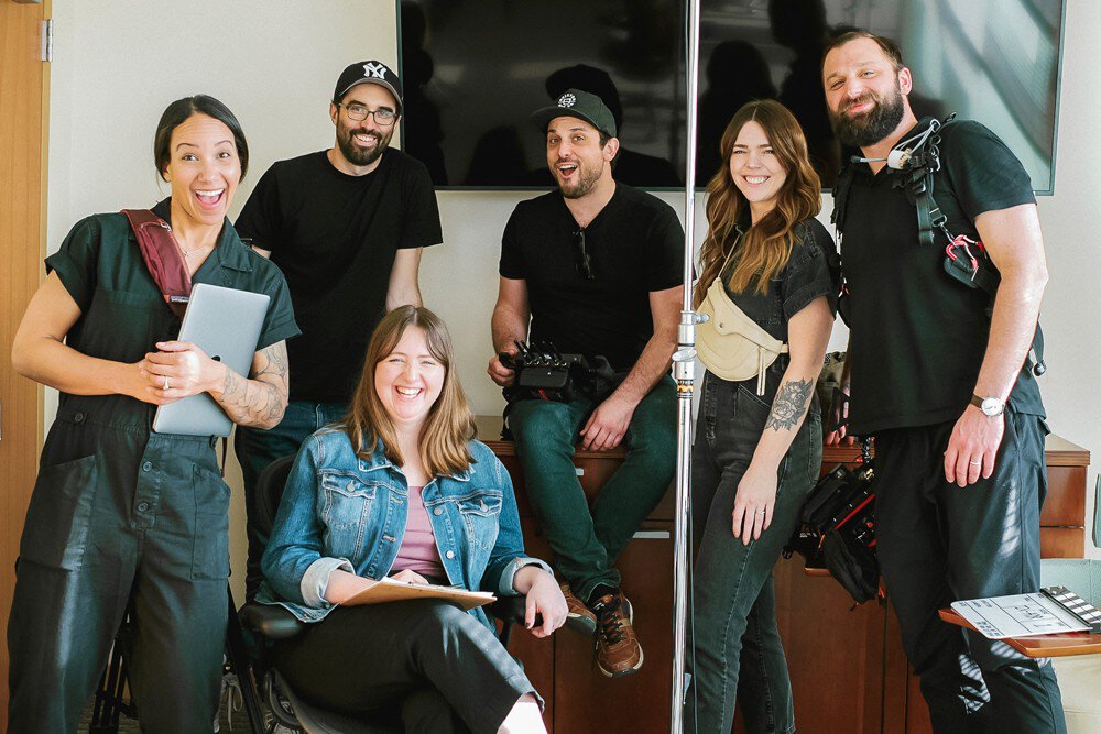 Jessyca Sterling (left), Jason Krangel, Sarah Voorhees, Sean Cunningham, Jenna Tormanen and Clay Howard, members of the Carnegie production crew, prepare on the set of the brand anthem video.