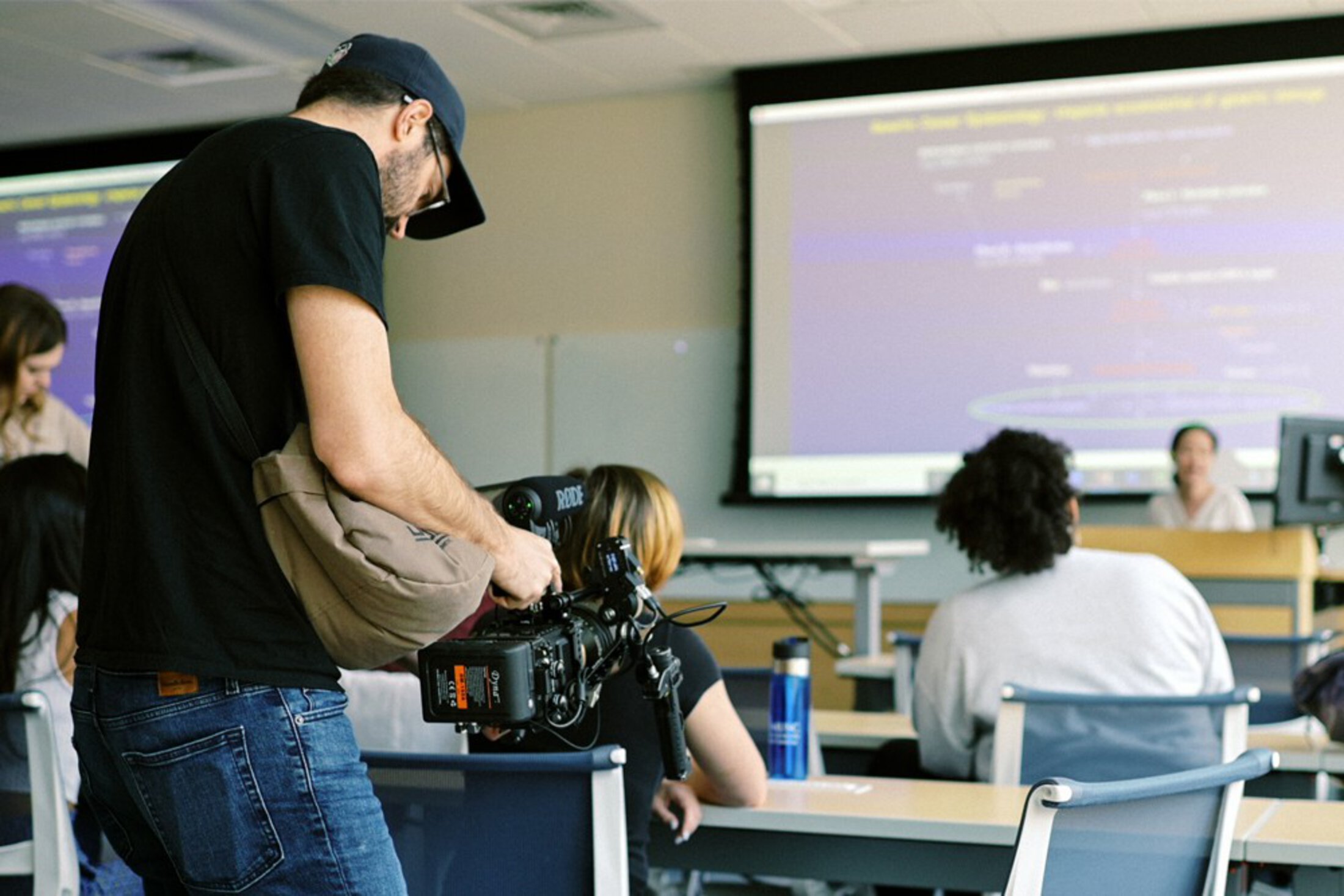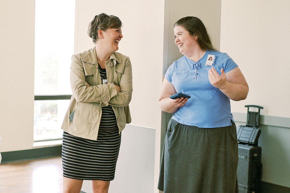 Jess Dennis (left), senior program manager of Enterprise Brand, and Jennifer Turner, director of Communications and Marketing for the College of Nursing, provide feedback on set.