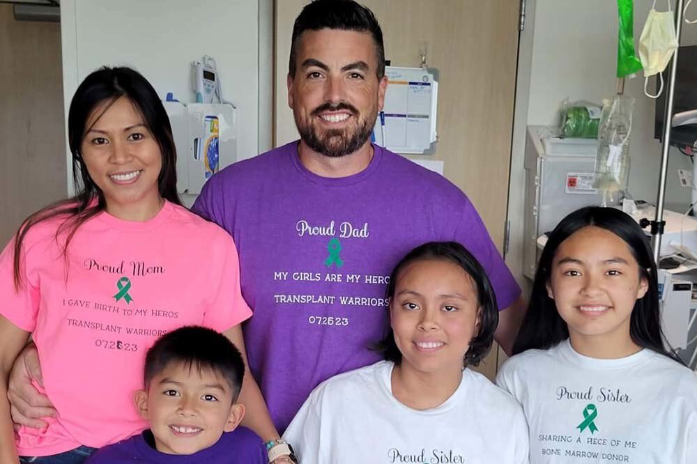 Parents Charlina and Max Wease with their children, wearing T-shirts marking the bone marrow donation between sisters Ava, left, and Allyssa.