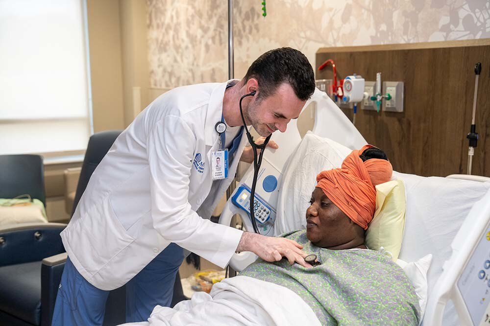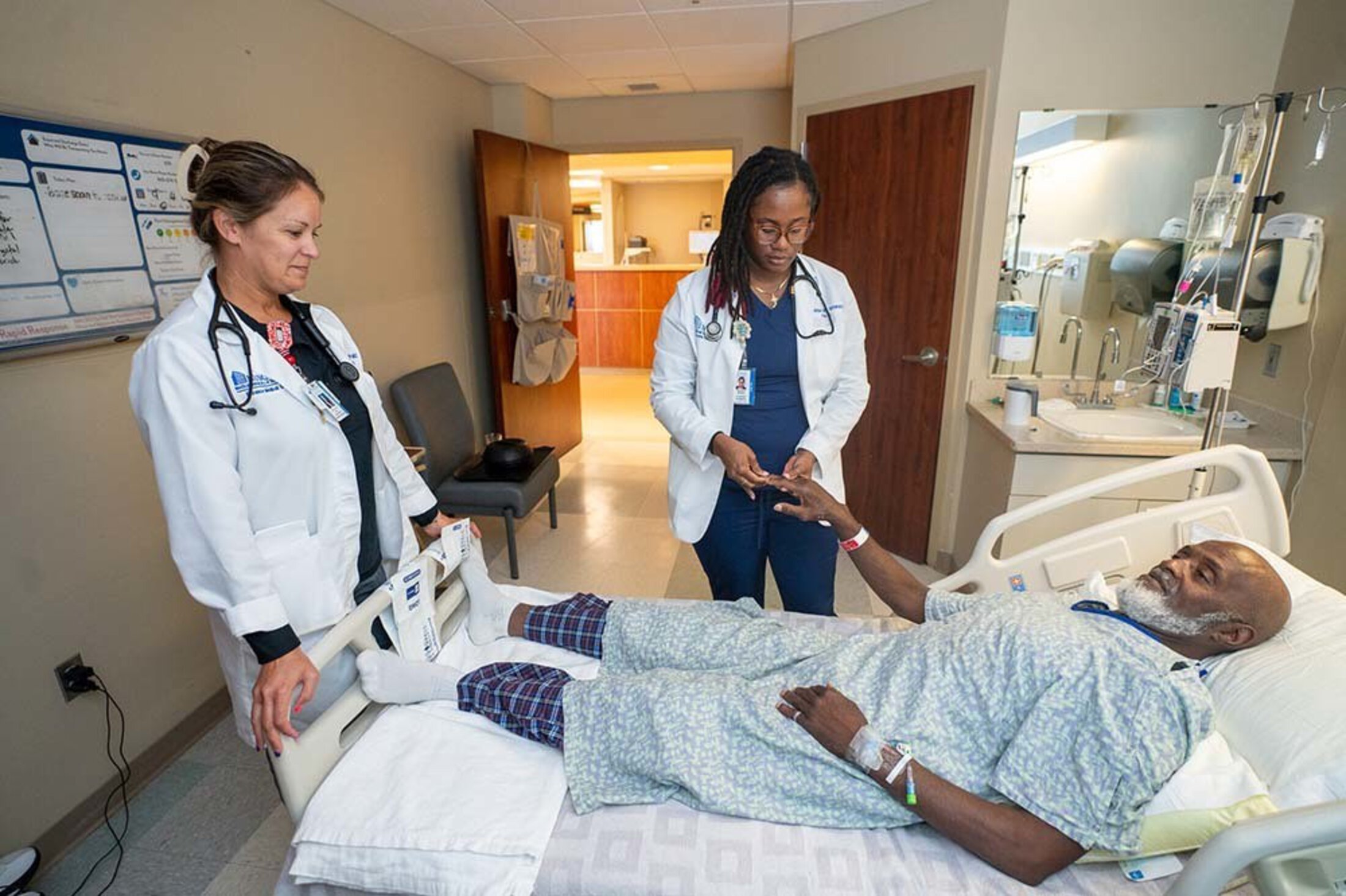 Physician assistant student Zachary Fuchs examines Barbara Gaskins.