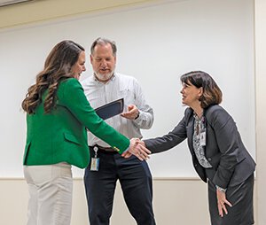 Dr. Julia Hohn receives congratulations from Drs. Donna Kern and Paul McDermott.