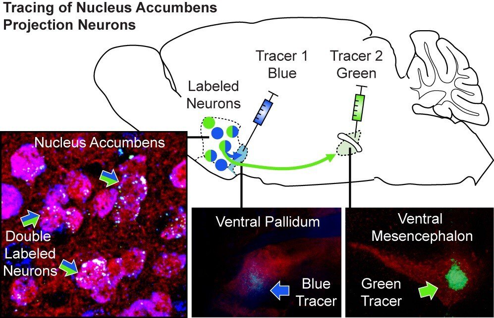 To investigate how D1-MSNs drive the motivation to seek drugs, the MUSC team traced the connections of these neurons. They showed that individual neurons project to both the VP and another major area that regulates motivation, the ventral mesencephalon (VM).