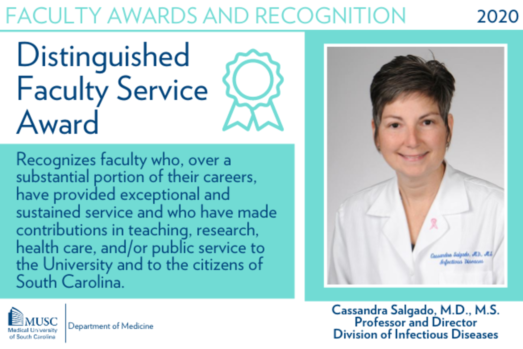 Two ideas come across strongly among those who nominated Salgado. First, weaving through her career is the thread of service to others—patients, students, mentees, colleagues. Second, what becomes apparent when learning about Salgado’s work is that she is a servant and a leader, she is reasonable and steadfast, she drives progress and reaches consensus—and she balances these often competing demands day and night. For these and other reasons, the Medical University of South Carolina Foundation is honored to bestow the Distinguished Faculty Service Award upon Cassandra D. Salgado, M.D., on August 18, 2020.