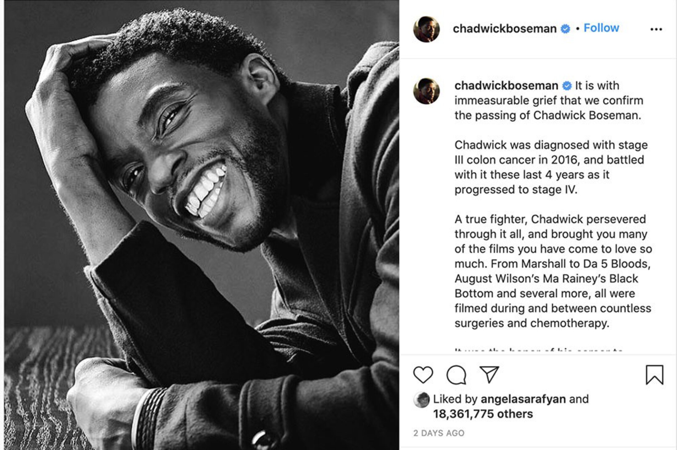 Boseman, 43, was diagnosed with stage 3 colon cancer in 2016. Stage 3 means the cancer had spread past the lining of his colon to the lymph nodes. The star of “Black Panther” and other high-profile movies died four years later, on August 28, 2020.