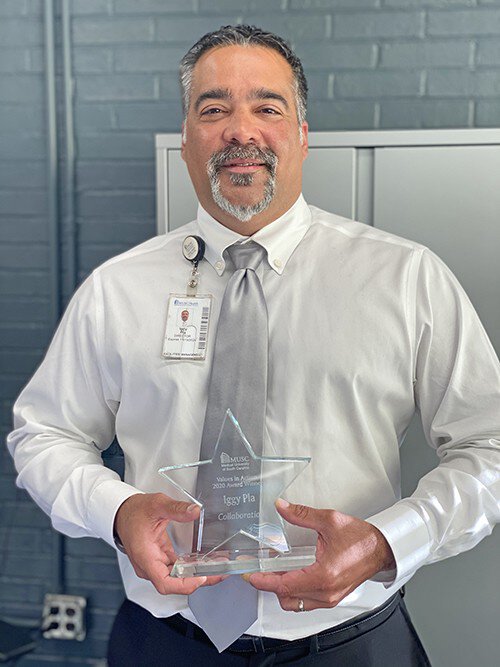 The Values in Action award for Collaboration went to Iggy Pla, director of hospital facilities maintenance, MUSC Health Facilities Management. Pla was recognized for his leadership, dedication and responsiveness throughout the COVID-19 pandemic, converting existing facilities to meet necessary criteria to treat and care for inpatients and support the needs of health care teams and staff.