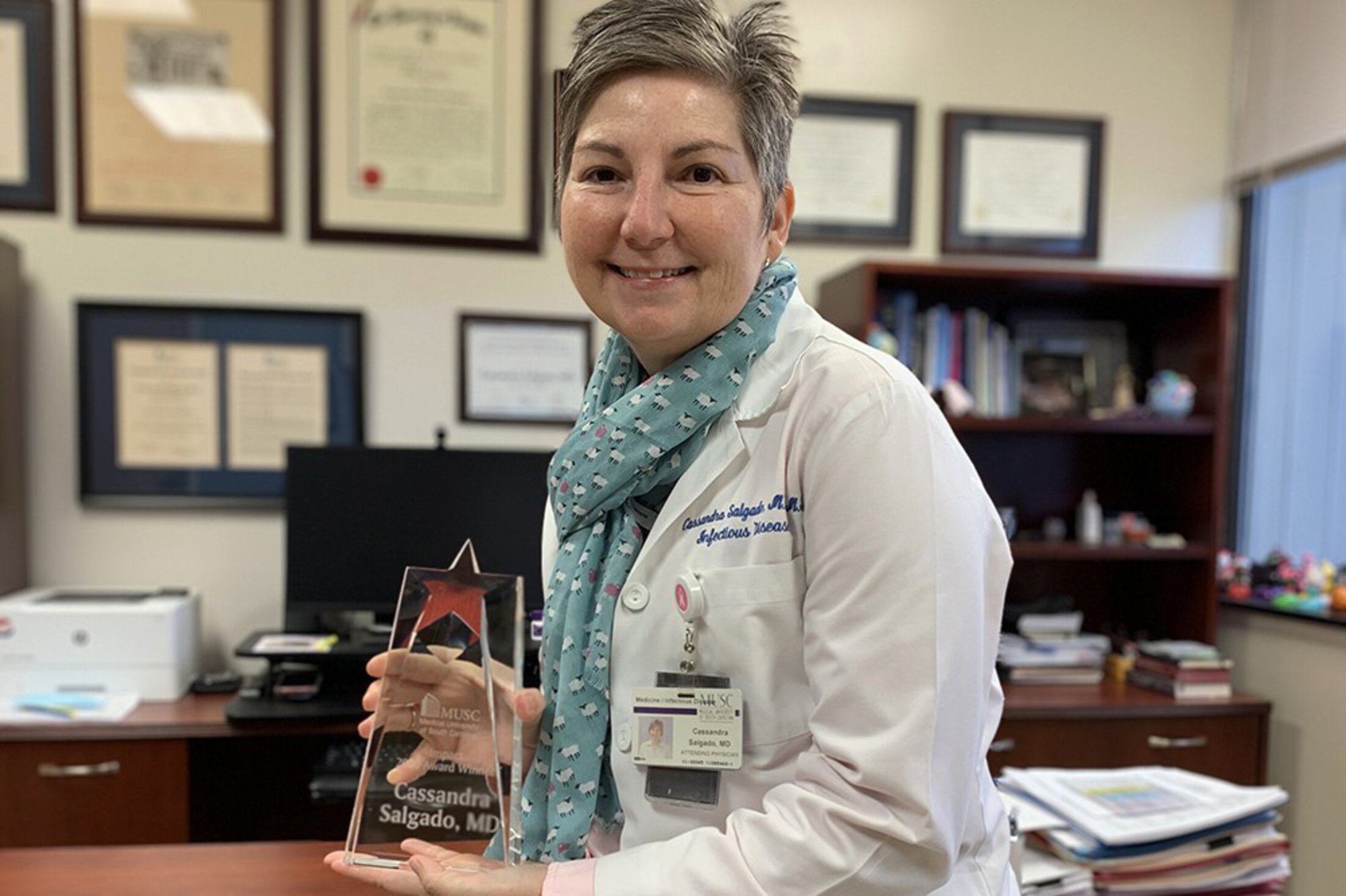 “Dr. Salgado has been at the front lines at our organization’s planning and response throughout the COVID-19 pandemic. She has served as an outstanding example of MUSC’s culture and values throughout this journey. As director of the Division of Infectious Disease, she and her team have risen to the challenges of this pandemic and have tirelessly engaged on behalf of this institution in ensuring that we are meeting the needs of those we serve. This is met ensuring we are addressing questions and concerns of our workforce with compassion and cognizant of the pressures that we face in our front-line providers and other care team members with respect to appropriate PPE and safety protocols, risk of infection and the like. Dr. Salgado has served as a trusted advisor to many across the organization from members of our board of trustees to physicians and front-line employees throughout this stressful time, and she has done so with the utmost patience, integrity and compassion. We are so very grateful to her and the team that she leads for all their incredible work,” wrote DuBois.