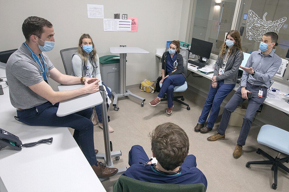 Dr. David Mills, right, rounds with pediatric physicians at MUSC Shawn Jenkins Children’s Hospital. Photo by Sarah Pack